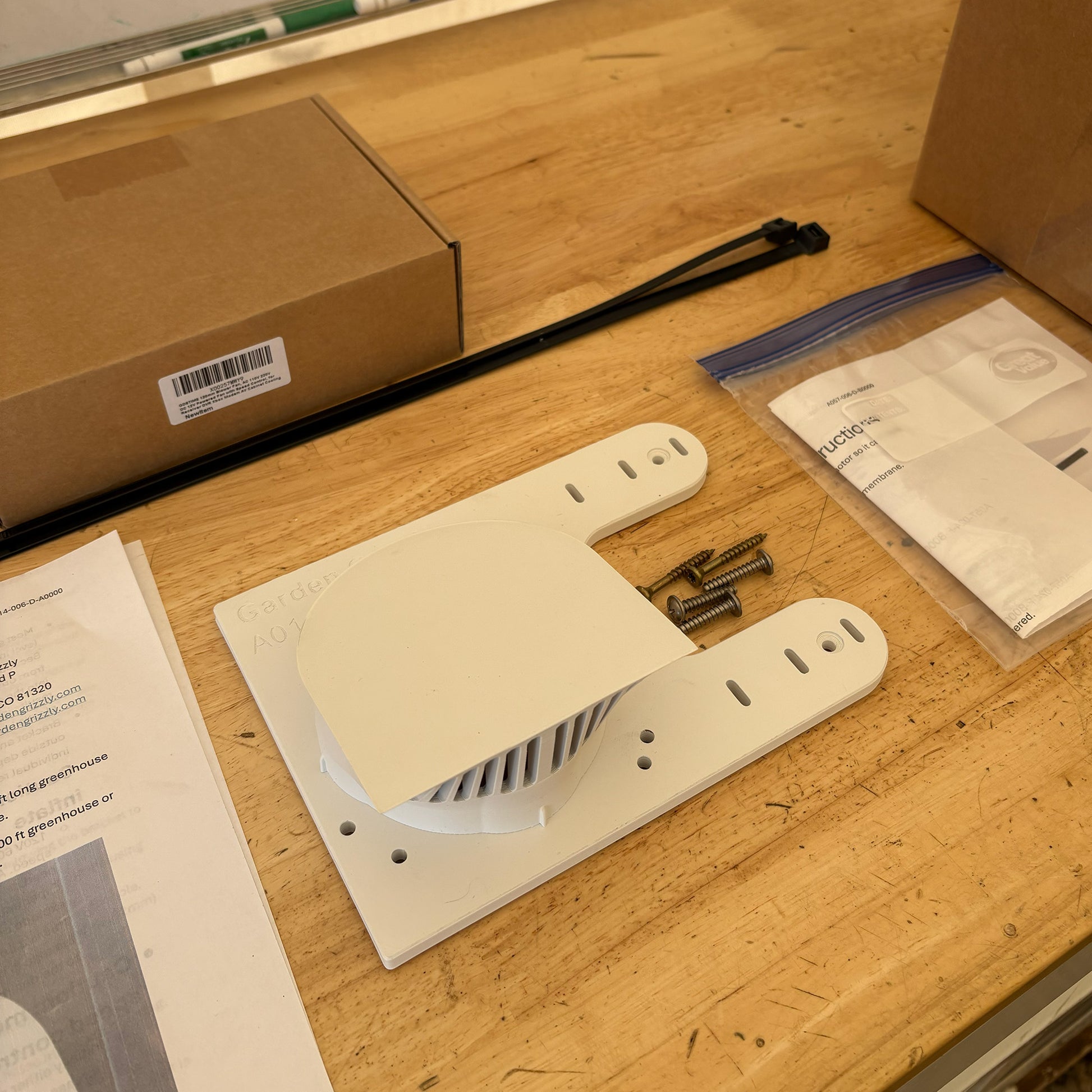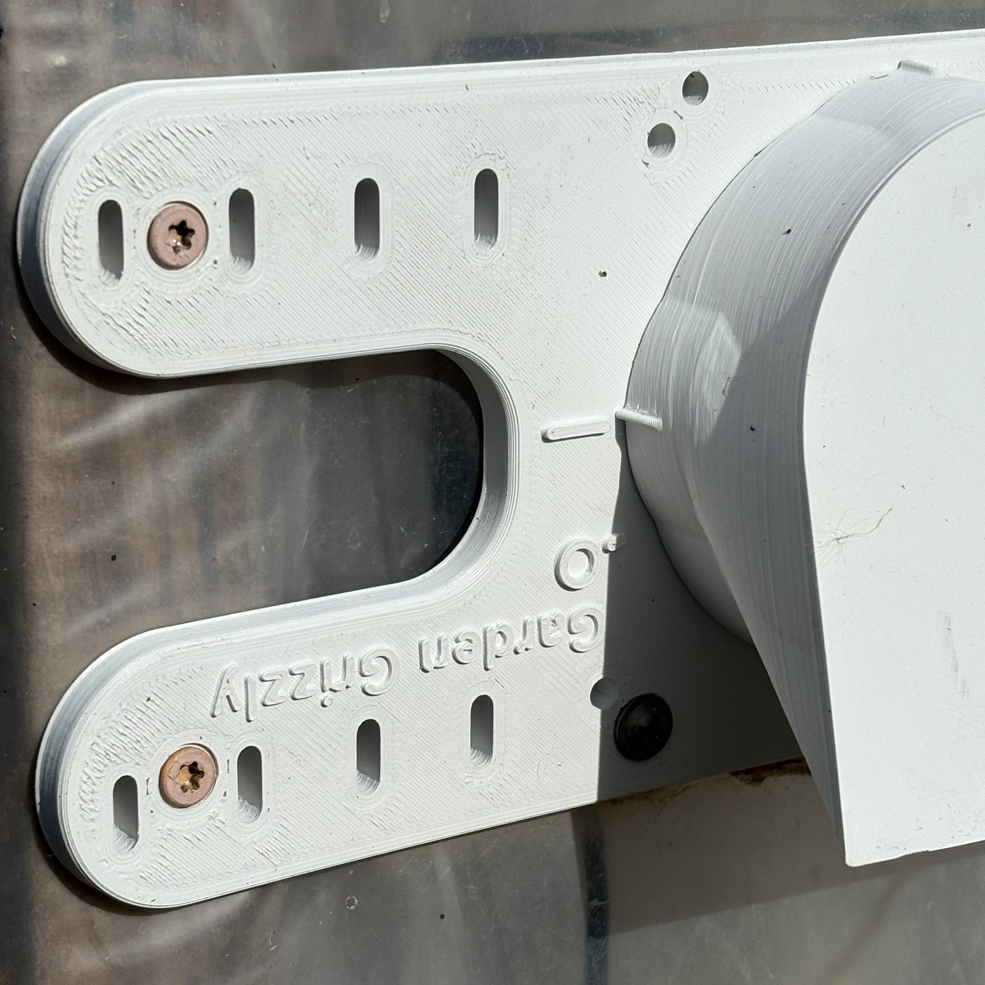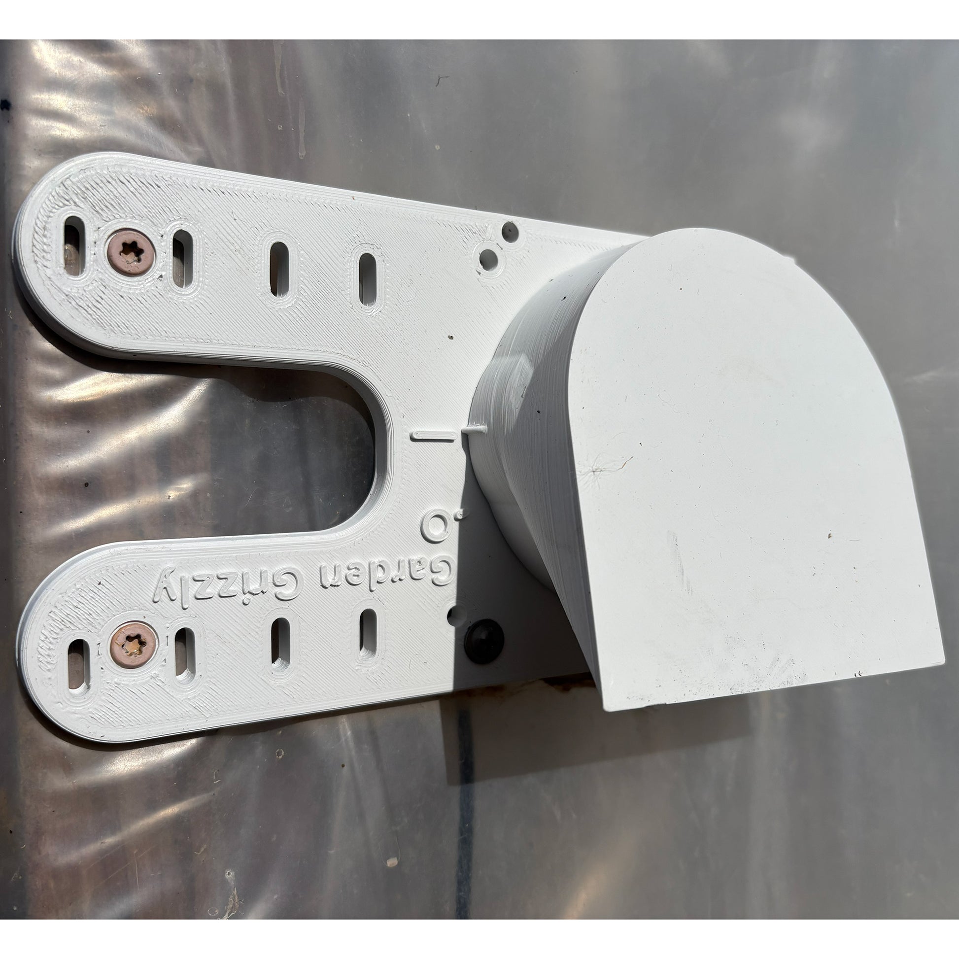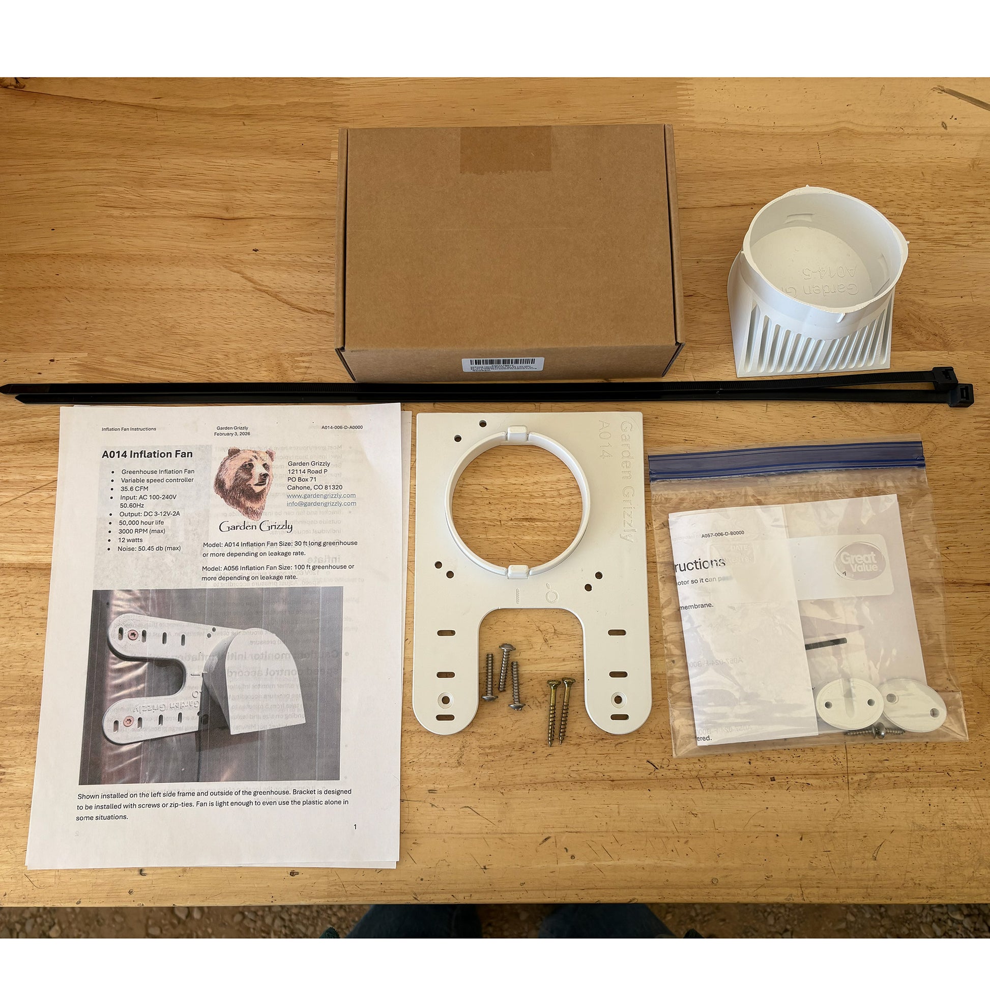 Greenhouse Inflation Blower with attach bracket and rain shield. Made from UV-stable plastic for inside or outside installation. All parts included for installation. 30 CFM, Brushless 50,000 hour motor inflates most medium size greenhouses easily. Input: 120V; 60Hz; Output is variable speed DC 3-12V. Only 12W maximum (less than half the power of legacy brands). Inlet can be installed from outside or inside the greenhouse. Replaces legacy inflation blowers. Variable speed means you don’t need a restriction plate on the blower and the longer life blower is both less maintenance and uses less power.